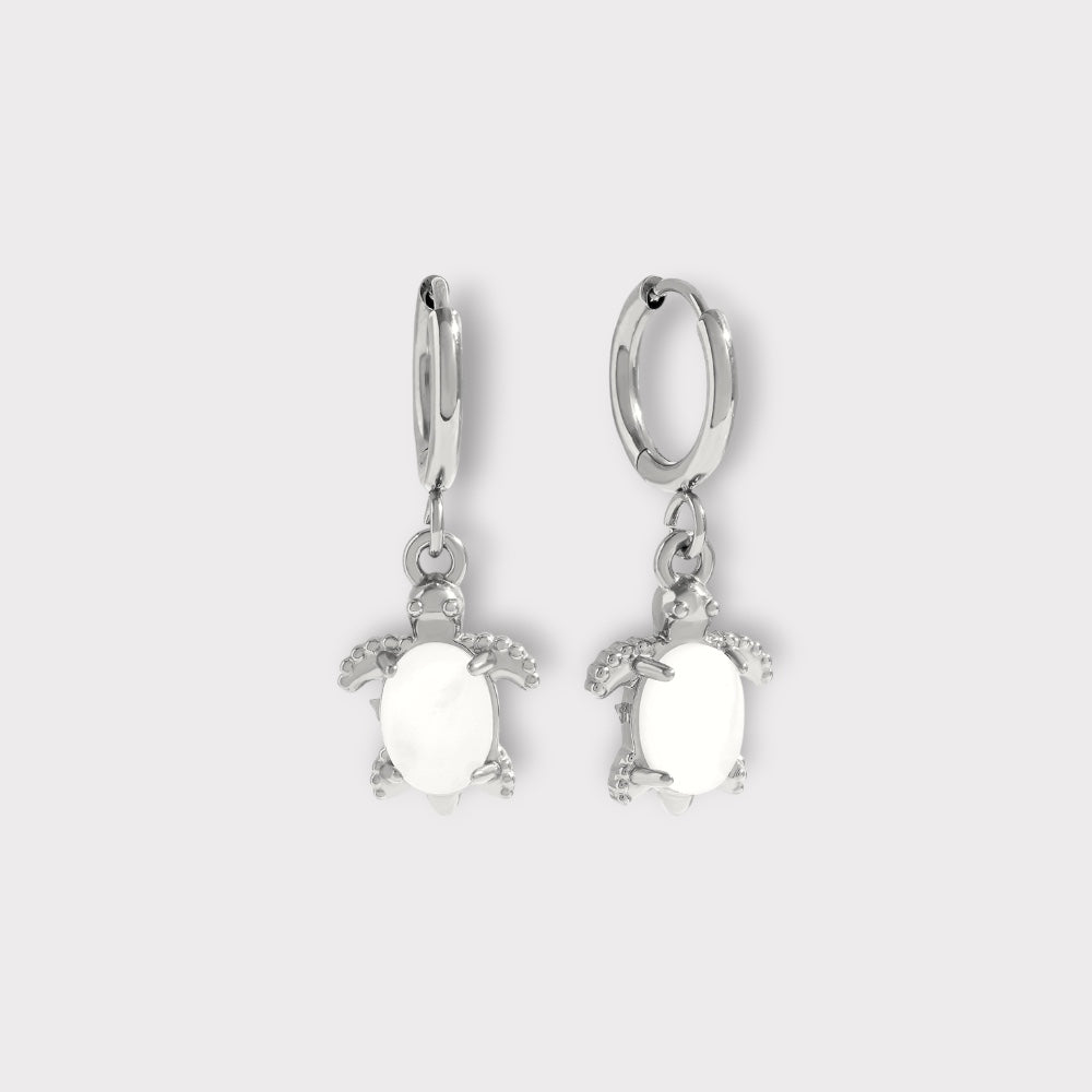 Gaia øreringene fra vores sommerkollektion er lavet i rustfrit stål og prydet med en skildpadde og knuste hvide muslingeskaller.
