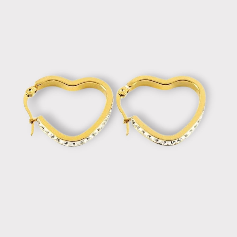 Elegante creoler i guldbelagt Vandfast Rustfrit Stål formet som hjerter, der giver et feminint og moderne udtryk. Den fine række af klar zirkonia sten langs den ene side tilfører et eksklusivt touch og gør øreringene perfekt til både hverdag og fest.