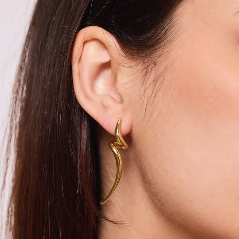 skiller sig ud med deres unikke, skulpturelle design og bløde, snoede form, der elegant følger ørets linjer. Øreringene har et moderne og kunstnerisk udtryk, som tilføjer et sofistikeret touch til både hverdags- og aftenlooks.