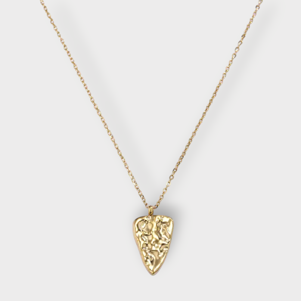 Denne struktur halskæde kombinerer det rå og det elegante i et unikt design, hvor vedhænget fremstår som et lille kunstværk i sig selv. Overfladen har et organisk og håndlavet udtryk, der giver halskæden en skulpturel karakter – perfekt til dig, der elsker smykker med personlighed.